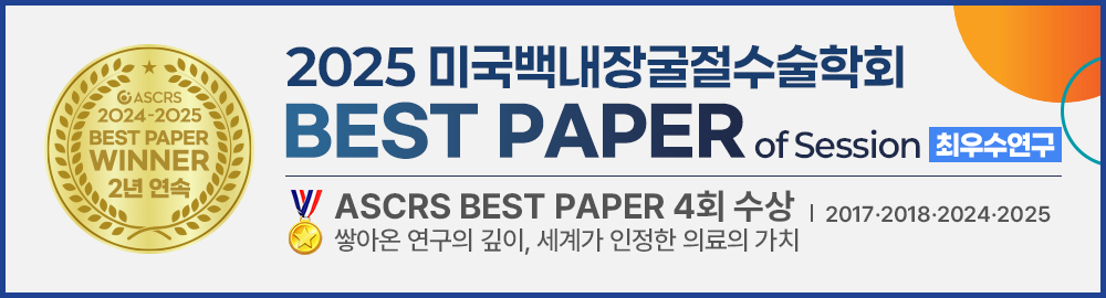 아이리움안과 스마일은 2024-2025 2년 연속으로 미국백내장굴절수술학회 BEST PAPER of Session(최우수연구)을 수상했습니다.