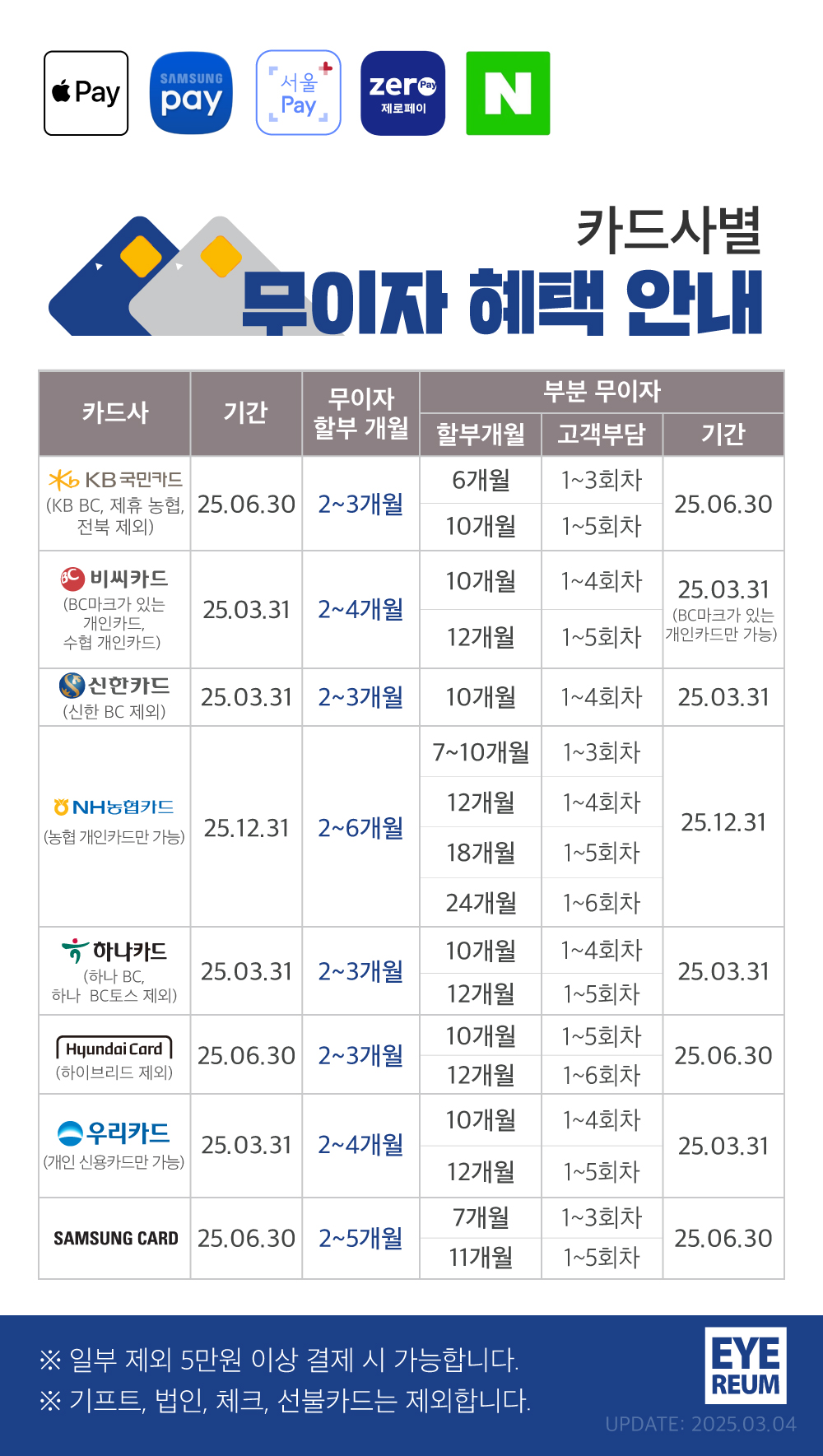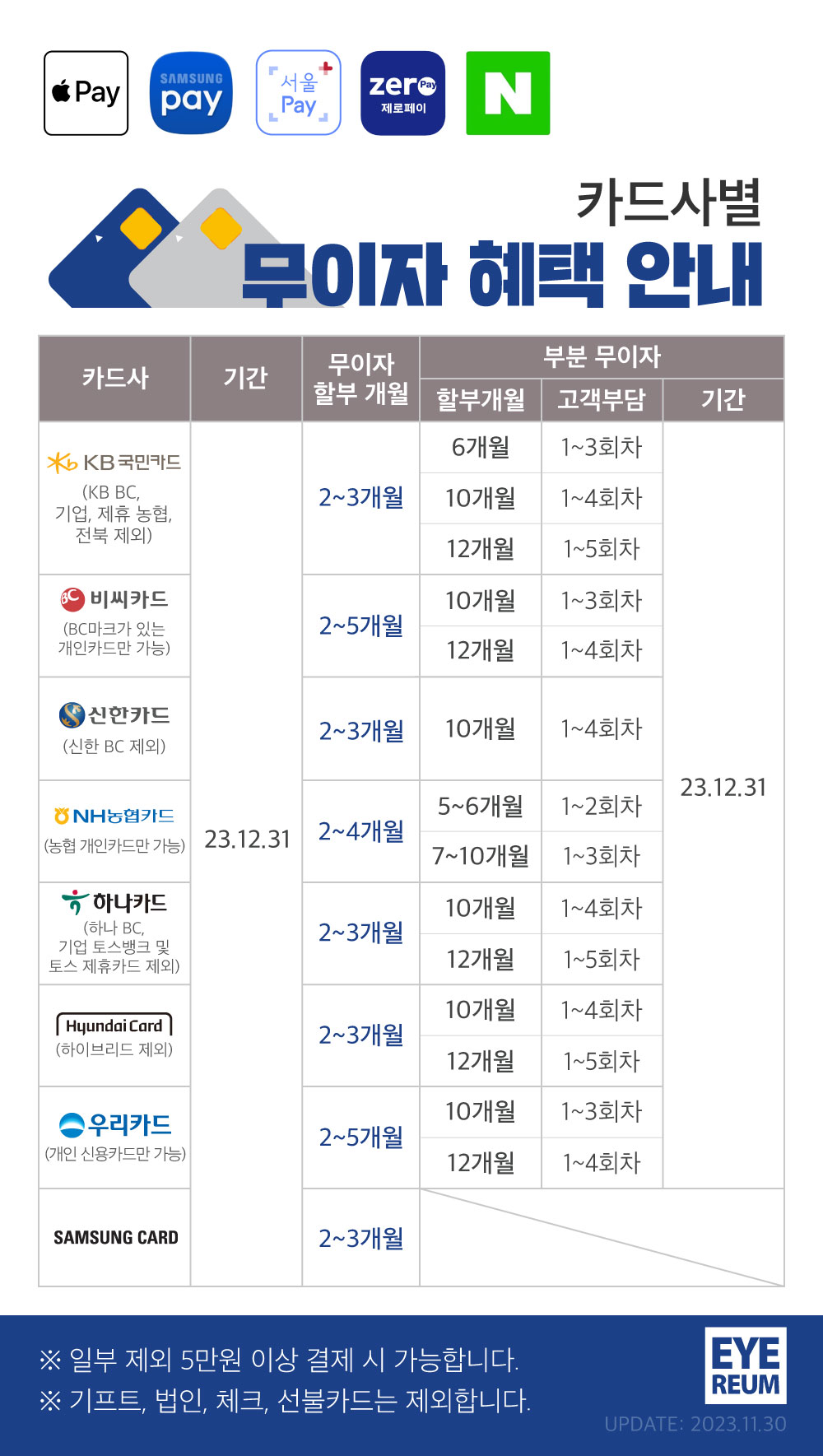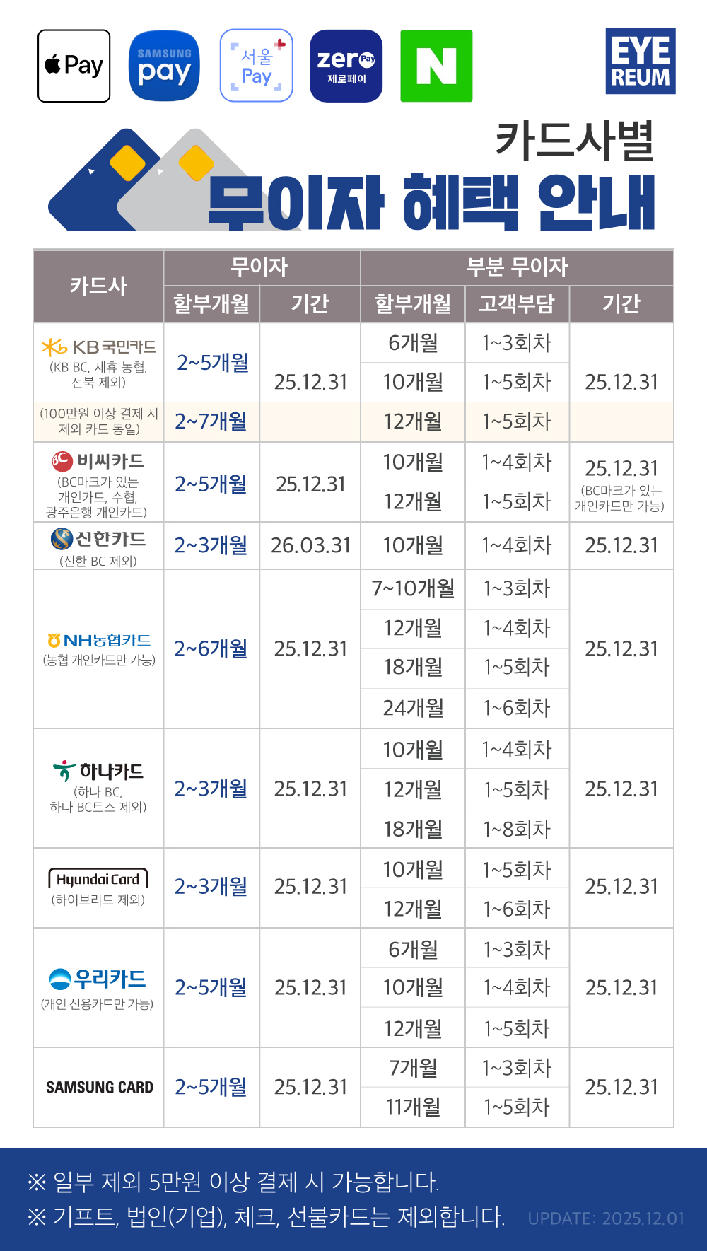 아이리움안과 카드사 별 무이자 할부 혜택