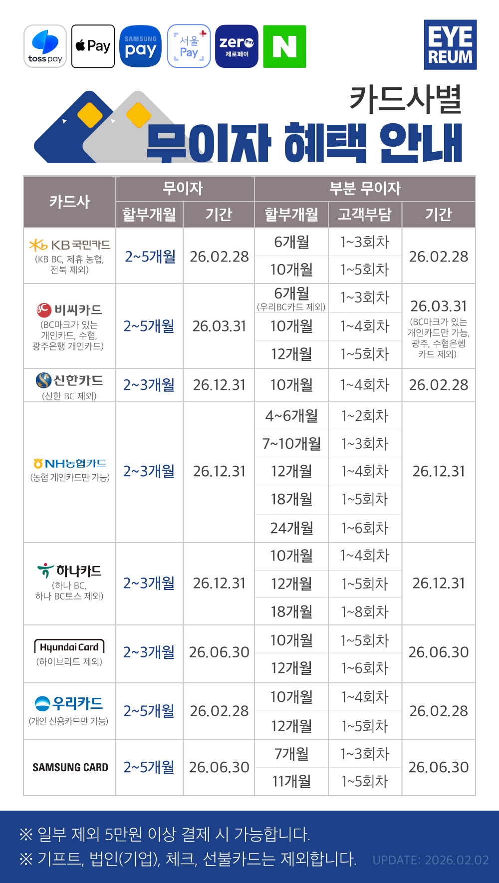 아이리움안과 카드사별 무이자 할부 및 간편결제 안내