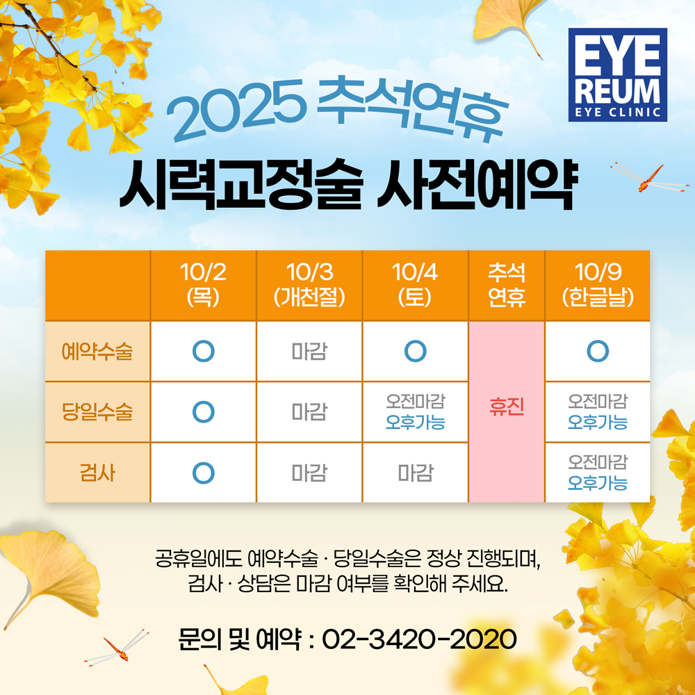 2025 추석연휴 시력교정술 예약가능일 확인하세요