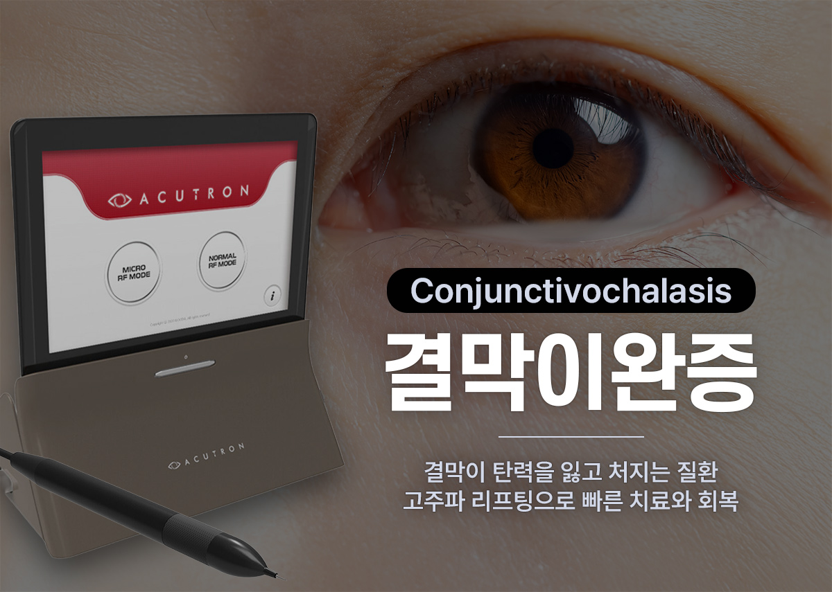 아큐트론(ACUTRON) 고주파 리프팅 치료는 고주파 열로 늘어난 결막을 수축시키는 방식으로, 따로 절개와 봉합이 없는 비수술적 치료를 통해 시술 후 빠른 회복과 흰자에 흉터가 없어 환자에게 부담이 적고 치료 후 관리가 쉬운 장점이 있습니다.