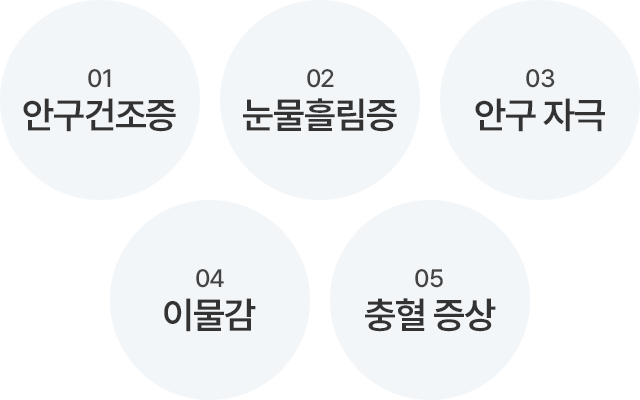 결막이완증이 발생하면 눈물의 정상적인 배출이 방해받아 눈 표면의 눈물막 형성이 불안정해져 안구건조증과 유사한 증상이 나타납니다.
