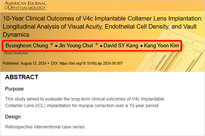 논문부분 학술상, 정병훈 원장AJO Volume 269p1-10 January 2025, 'V4c 렌즈삽입술의 장기적 임상 결과(10-Year Clinical Outcomes of V4c Implantable Collamer Lens Implantation: Longitudinal Analysis of Visual Acuity, Endothelial Cell Density, and Vault Dynamics)'
