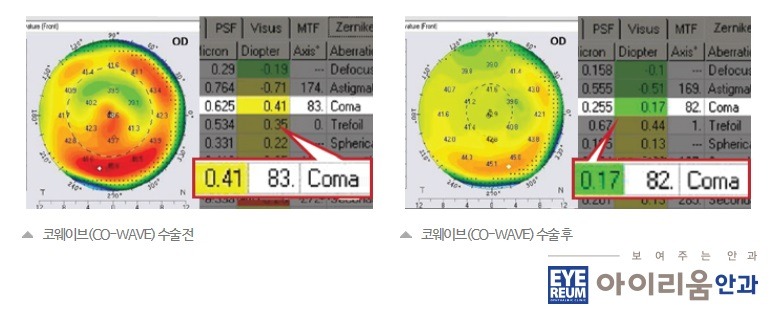 기본적인 근시, 난시 교정을 넘어서 수술 후 빛 번짐, 눈부심 등의 부작용을 유발할 수 있는 미세한 각막 굴절이상(고위수차)까지도 교정 가능하며, 앞서 말했듯 실제로 아이리움안과에서 수술한 코웨이브 수술 환자들의 임상 결과 수술 후 고위수차 중 특히 코마(Coma) 수치가 38.7% 감소함을 확인하였습니다.
