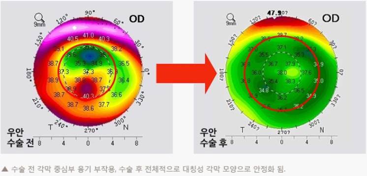 평균 1.0의 시력회복을 보이는 빠른 회복속도를 보이고 있으며 수술 전과 후, 각막의 강성도(각막의 내구성을 나타내는 지표)가 유지된다고