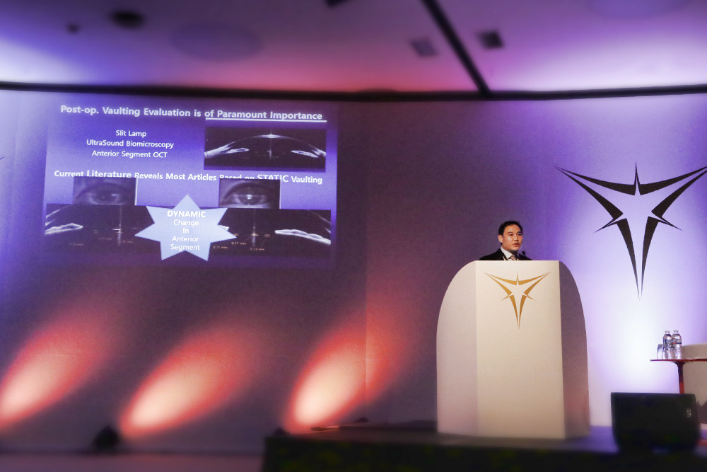 ▼2015 ICL 전문가 심포지엄에서 아쿠아ICL의 볼팅값(렌즈와 수정체간의 거리) 변화 '다이나믹 볼팅' 현상을 강연중인 강성용 원장