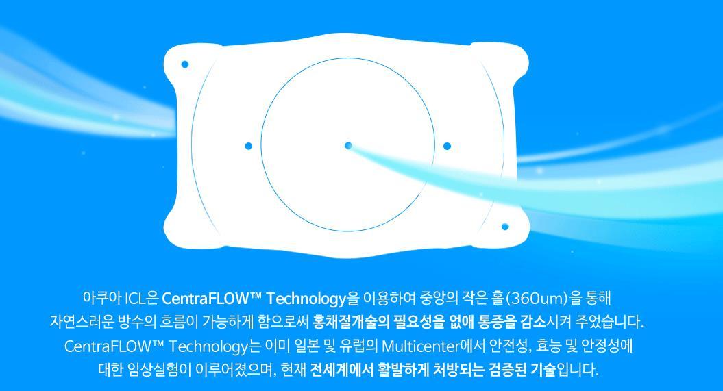 아쿠아 ICL PLUS는 렌즈 중심부에 있는 360㎛의 Hole을 통해 눈 속의 각종 부속물 및 잔여물에 의해 생길 수 있는 막힘 현상을 방지하고 안구 내 방수 흐름을 원활하게 해주는 것이 가장 큰 특징입니다. 이렇게 개선된 방수 흐름으로 인해 안구 내 ICL이 움직이면서 수정체와의 접촉으로 생길 수 있는 백내장의 발생 가능성도 크게 낮추게 되었습니다. 홍채성형술이 없는 안내삽입렌즈로도 잘 알려져 있습니다.