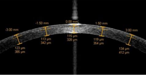 원추각막이 발생한 위치의 각막 상피 두께는 다른 지점보다 얇게 나타납니다.