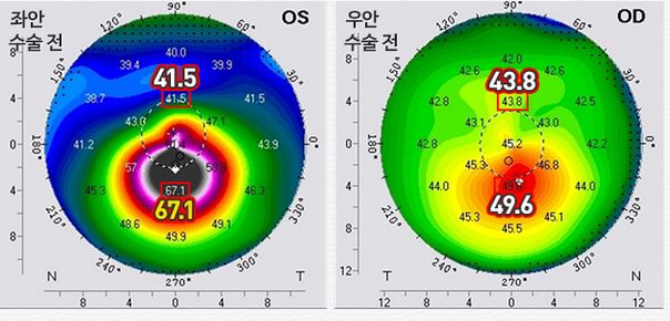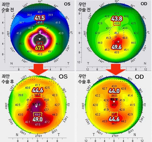 ▲ 최종 수술 전vs후 각막지형도를 통해 확인할 수 있듯이,