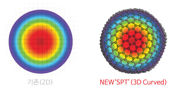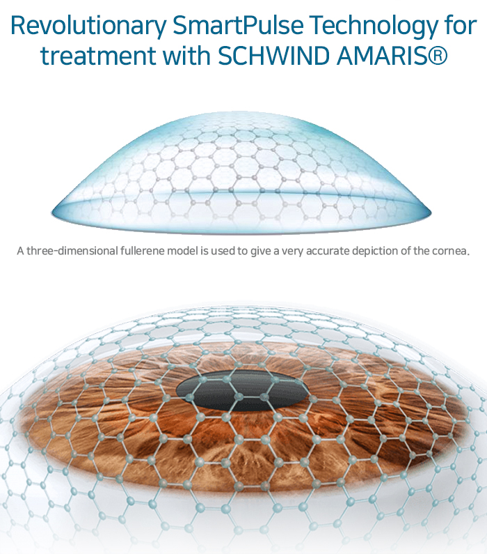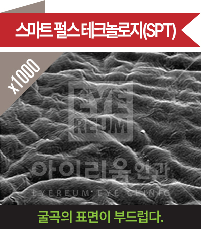 스마트펄스 테크놀로지(SPT)는 현존하는 레이저 알고리즘 중 실제 우리 눈의 각막 곡률을 가장 사실적으로 구현한 레이저 조사 방식입니다. 사람의 눈은 축구공처럼 구 모양이기 때문에 각막의 실제 곡률을 고려한 입체적인 레이저 수술기법이 필요했습니다. 기존 방식은 편평한 2차원 좌표 위에 레이저를 조사할 지점의 결정하지만, 새로운 알고리즘, 스마트 펄스 테크놀로지(SPT)는 입체적인 탄소분자모형 구조(Fullerene Structure)를 기반으로 각막 곡률에 맞는 3차원 좌표(x, y, z) 값을 정해 구 모양의 각막에 입체적으로 레이저를 조사합니다.