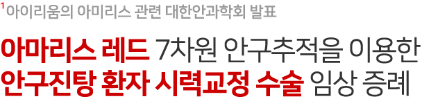 그동안 눈동자의 떨림이 심한 안구진탕 환자의 경우 정확한 위치에 레이저를 조사하는데 어려움이 있어 라식이나 라섹과 같은 시력교정술의 기회조차 얻기 힘든 경우가 많았으나 최신 아마리스 레드 1050RS는 독보적인 7차원 안구추적 시스템과 1050hz의 레이저 조사속도로 추적 즉시 레이저 조사가 가능한 1대 1 시력교정술이 가능해졌습니다.