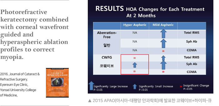 아마리스 RED SPT를 이용한 하이퍼-큐 라섹과 코웨이브(커스텀아이즈, CustomEyes) 라섹, 그리고 일반 라섹 수술의 2개월 후 결과를 비교하였더니 하이퍼-큐 라섹의 경우에서 구면수차가 125% 감소되는 것을 확인할 수 있었습니다.