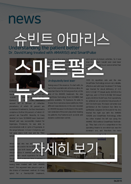 아마리스레이저의 3D 알고리즘, 스마트펄스(AMARIS Smart Pulse) 개발 프로젝트를 위해 한국을 비롯하여 이탈리아, 독일, 네덜란드, 캐나다, 싱가포르 등 8개국에 아마리스 스마트펄스(SPT) 연구를 위한 안과 의사들이 참여했습니다. 당시 한국에서는 유일하게 아이리움안과 강성용 원장이 본 프로젝트에 참여했습니다. 슈빈트 아마리스레이저의 스마트펄스 알고리즘은 현재 Smartsurface 라는 이름으로 제공되고 있으며 개발 후 The Ophthalmologist 에서 Innovation Award 2015에 소개하기도 하였습니다.