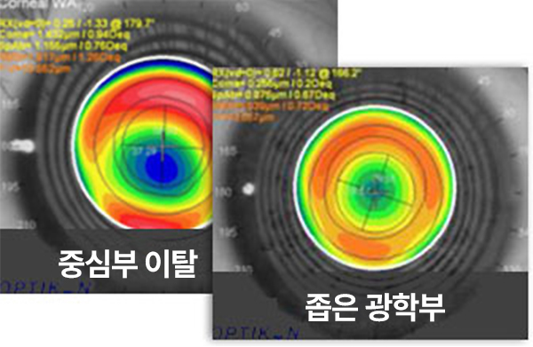 원인 : 일명 디센터(Decenter)라고 불리며 레이저가 주시축에 조사되지 않고, 어긋나서 조사되는 경우. 과거 엑시머레이저의 한계, 또는 주시축을 고려하지 않고 수술을 진행한 경우 발생될 수 있습니다.