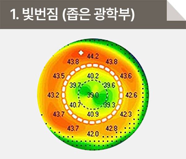 원인 : 수술전 사전에 환자의 동공크기와 각막 절삭량, 광학부 등을 고려하지 않고 수술을 할 경우 발생하게 됩니다. 이는 야간에 동공크기가 확대되면서 광학부 주변으로 오는 빛이 흐려지는 현상입니다.