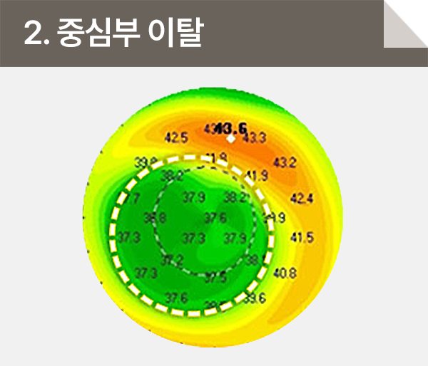원인 : 각막이 깍이지 않는 부분이 발생하거나 표면의 뒤틀림 현상이 발생하며 부정난시 또는 각막융기가 관찰될 수 있습니다. 각막지형도의 중앙부위에 각막융기가 관찰됩니다.