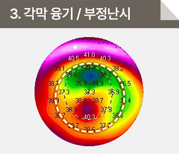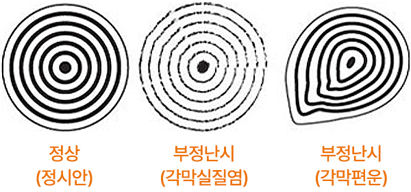 각막이 매끈하지 않은 경우, 중심부 이탈, 중심부 융기, 부정난시, 각막혼탁
