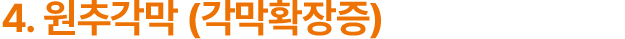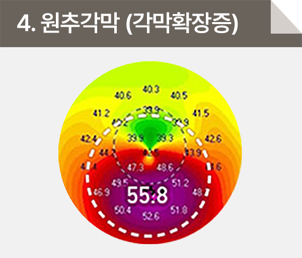 원인 : 각막이 일부가 얇아지면서 원래 모양을 유지 못하고 돌출되는 진행성 질환이며 각막두께를 안전 기준 이하로 수술받을 경우, 눈을 자주 비비는 행동 등 충격이 자주 가해졌을 때 원추각막이 발생합니다.
