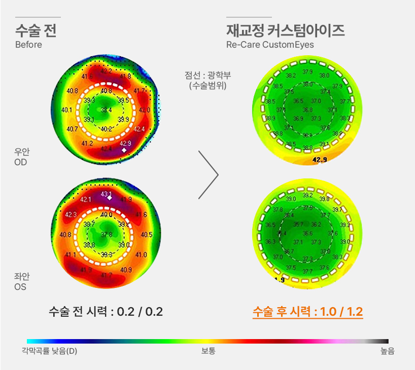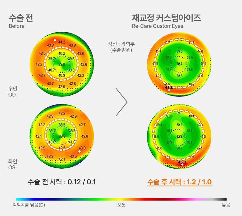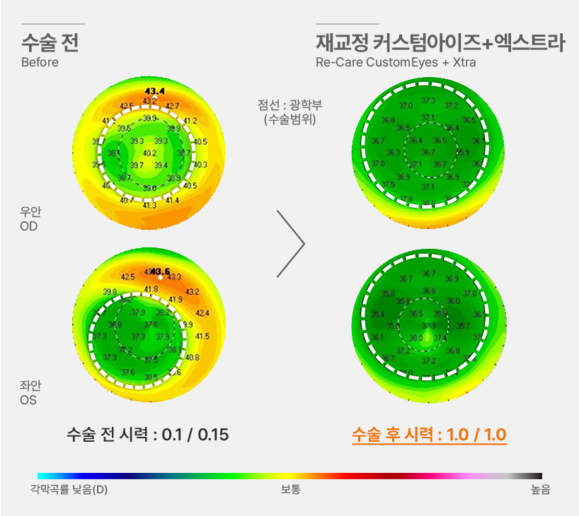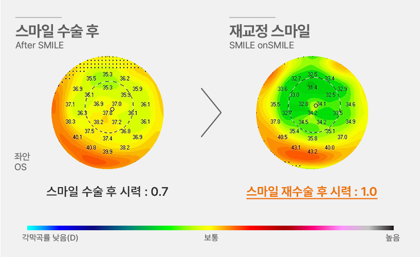 고도근시와 난시였던 왼쪽 눈이 저교정 되어 스마일라식으로 재교정 치료를 받으셨습니다.