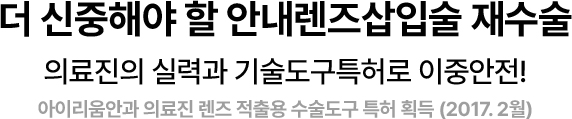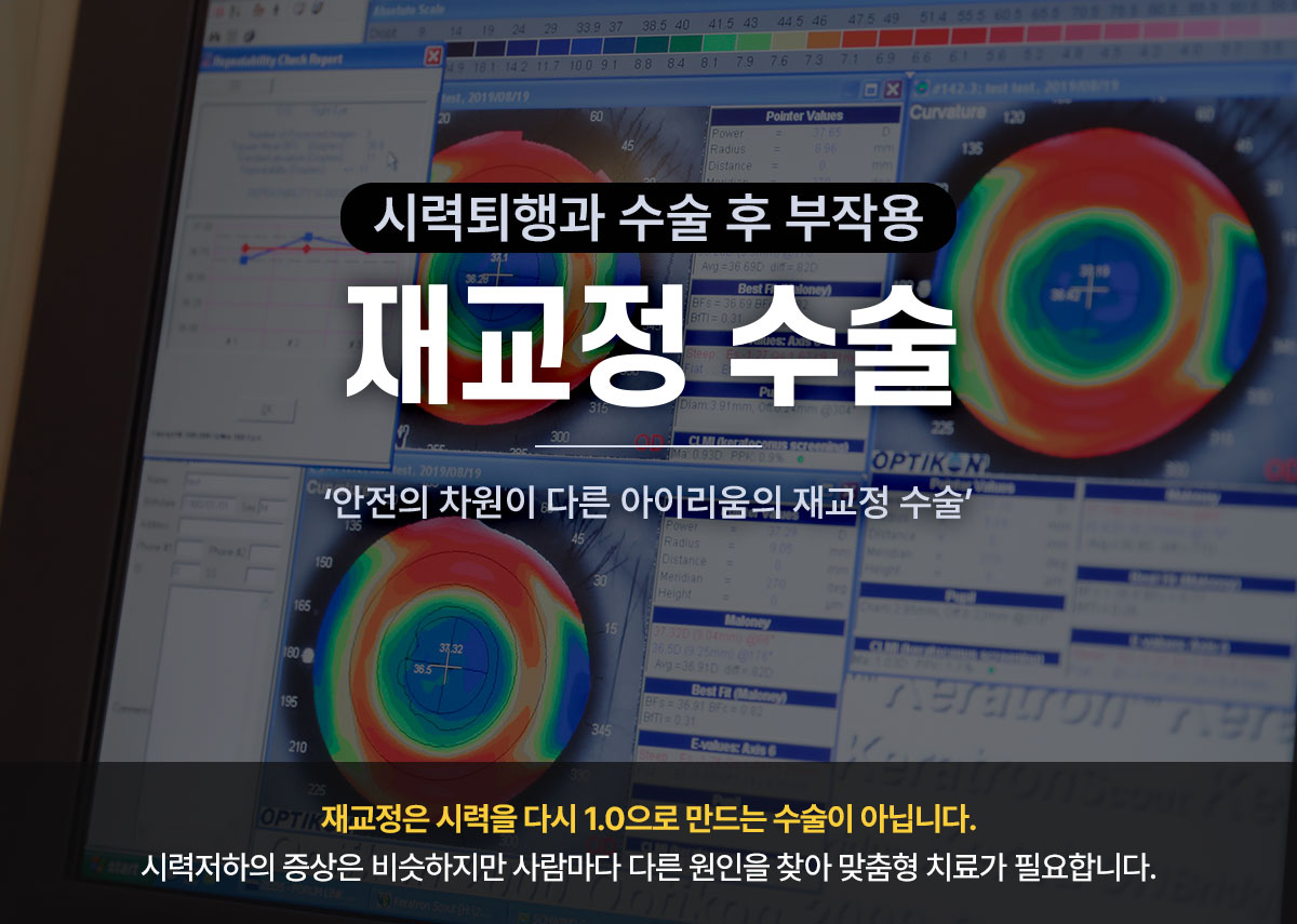 환자 안전을 지향하는 아이리움안과 의료진은 풍부한 재수술 경험과 노하우로 환자 별 최적의 재교정 수술 방법을 찾아드립니다.
