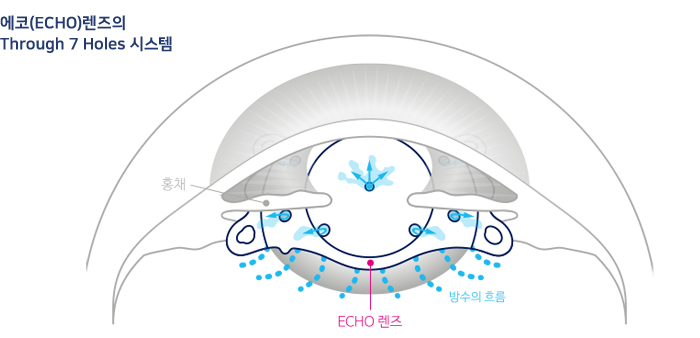 눈 안에 흐르는 물, 방수의 순환이 원활해야 안구 내부 조직에 영향이 공급되고 안압이 정상적으로 유지됩니다. ECHO 렌즈의 Through 7 Holes System은 방수의 흐름을 원활하게 하여 더욱 편안하고 안전한 렌즈삽입술이 가능합니다.