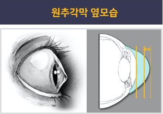 - 각막이 중앙보다 약간 아래쪽을 정점으로 하여 원뿔형으로 솟아 오름