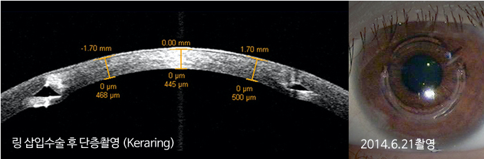 최근에는 진행된 원추각막 환자 중 콘택트렌즈로 시력 교정이 안되거나 콘택트렌즈를 착용하지 못하는 경우에 각막이식술을 받기 전에 해볼 수 있는 시술로 각막실질 내 고리 삽입술(케라링)이 시행되고 있습니다. 각막을 주변부로 잡아당기는 효과로 인해, 각막이 펴지게 되며 원추각막을 완화시키고 근시도 교정하는 효과를 가집니다. 링은 원추각막의 상태에 따라서 한 개 혹은 두 개를 넣을 수 있습니다. 케라링(Keraring)의 경우 시술 후 불편감이 있으면 제거하여 원상복귀가 가능한 장점이 있지만, 각막이 지나치게 얇아진 원추각막의 경우는 시술을 받을 수 없습니다. 유럽 CE와 국내 식약처에서 안전성을 입증받은 케라링은, 난시의 교정효과가 뛰어나다는 장점이 있으나 동공에 더 근접해서 삽입하므로 빛 번짐 현상이 더 발생할 가능성이 있어, 단면 구조를 프리즘 모양 디자인으로 만들어서 이러한 문제를 보완할 수 있게 되었습니다.