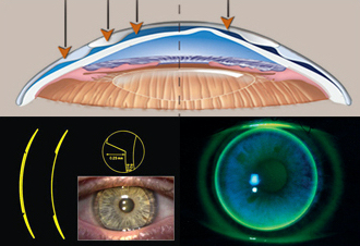 콜라겐이 서로 겹겹이 맞물려 있는 구조를 하고 있는 각막은 원래의 모양을 유지할 수 있습니다. 원추각막 환자의 경우 이 콜라겐의 결합력이 견고하지 못하여 각막 형태가 원추 모양으로 변형이 되는 것이며 따라서 이 결합력을 강화시키는 방법을 사용하면 치료 효과를 얻을 수 있습니다. 각막 콜라겐 교차결합술은 리보플라빈 (Riboflavin, Vitamin B2)이라는 약제를 각막 내로 스며들게 한 뒤 자외선(Ultraviolet Light A)을 조사하여 각막 실질 내의 콜라겐끼리 교차결합을 강화함으로써, 원추 각막의 진행을 억제하고, 튀어나온 각막이 들어가서 콘택트렌즈를 잘 착용할 수 있게 하며, 일부 시력개선 효과도 가져올 수 있습니다. 이 시술은 각막을 강화하여 원추각막을 근본적으로 인체의 생리에 맞게 치료하는 방법이라 할 수 있습니다. 또한 인텍스나 케라링과 같은 각막실질 내 고리삽입술에 추가로 사용하여 그 효과를 향상시킬 수 있는 장점도 있습니다.