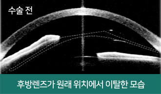 전방렌즈삽입술 후 오른쪽 눈에 외상을 입어 렌즈가 원래 위치에서 이탈한 사례. 렌즈 위치 교정 수술 진행