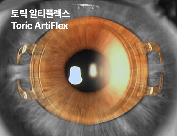 토릭 알티플렉스(Toric Artiflex Lens)는 근시와 난시를 동시에 교정할 수 있는 렌즈이며, Hydrophobic Polysiloxane라는 특수 재질로 되어있어 접합성 조절이 가능하기 때문에 렌즈삽입 수술 시 각막절개창을 작게 만들 수 있어 난시 유발 현상이 매우 적습니다.
