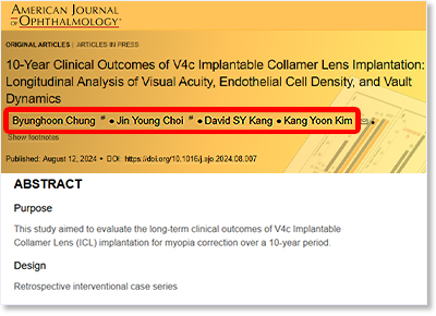 2014-2015 후방 렌즈삽입술 후 '생체 내 다이나믹 볼팅 현상' 규명해 ICL 렌즈삽입술 수술 설계와 수술의 국제안전기준 제시, 2016년 토릭 전방렌즈vs근시렌즈+LRI(각막윤부완화절개술) 난시교정 효과 비교 논문으로 3년 연속 SCI 논문 기록