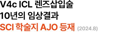 국내 도입 10년을 맞이한 V4c ICL렌즈. 아이리움안과의 ICL 렌즈삽입술 10년간 수술결과를 분석, 연구 결과 효과적인 시력교정, 장기적 안정성과 안전성을 확인했습니다. 아이리움안과의 ICL 렌즈삽입술 결과가 좋은 이유는 수술 전문성과 더불어, 수술 전 검사와 수술 후 정기검진 전과정이 매우 중요합니다.