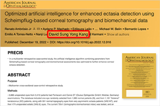Optimized artificial intelligence for enhanced ectasia detection using Scheimpflug-based corneal tomography and biomechanical data. AJO. Dec 2022, doi: 10.1016/j.ajo.2022.12.016