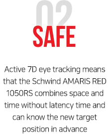 The Schwind AMARIS RED 1050RS is an innovative laser which delivers an unsurpassed repetition rate of 1050 HZ – currently the highest of all excimer lasers on the market – and an active 7D eye tracker. The new, ground-breaking Latency Free Tracking considers the time factor, the 7th dimension. Latency Free Tracking compensates for eye movements that occur in the period between acquisition of the eye tracker image and triggering of the subsequent laser pulses.
