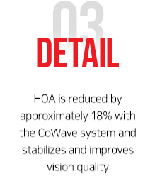 Schiwind AMARIS Inc. appointed EYEREUM as Asia-Pacific official research center in 2011 mainly due to our Co-Wave technology. Co-Wave, Corneal Wavefront, eliminates the possibility of HOA after surgery by more than 38% (presented by EYEREUM chief director Dr. David Kang(David Sung Yong Kang) at the 2015. 9 ESCRS) and surprisingly reduced night blurred vision. In short, Co-Wave is an advanced tailored surgery customized to each person’s eye.