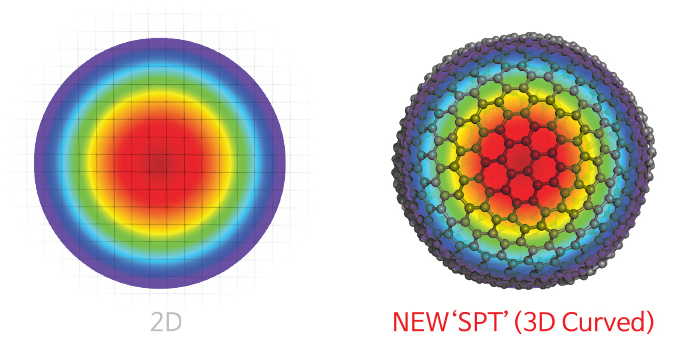 SPT uses a sophisticated geometric model based on a fullerene structure. This three dimensional model depicts the curvature of the cornea very realistically, and the fullerene structure makes it possible to position the pulses more closely than ever before. This is particularly marked at the periphery of the cornea. The totality of this innovation results in a very smooth corneal surface.
