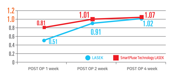 Clinical test results from the 8 SPT official research centers showed that SPT smoothed the cornea surface, innovatively improving vision quality, reducing recovery time and pain, and effectively preventing blurred vision. EYEREUM, one of SPT official research centers, performed LASEK surgery with SPT on patients with an average -7D. Within a week after the surgery, the patients’ recovery was 1.6 times quicker than those who just had standard LASEK procedures, and after 2 weeks those patients reached a 20/20 vision.