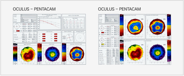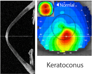 Keratoconus is a progressive eye disease in which the normally round cornea thins and begins to bulge into a cone-like shape. The exact cause of keratoconus is not yet known, but it usually starts in the teenage years. It can, though, begin in childhood. Also after vision correcting surgery, the abnormally thin cornea can’t withstand the eye pressure and the area below the center of the cornea starts to bulge. This is the most devastating complication after any laser eye surgery and occurs when the minimal corneal thickness was not preserved.