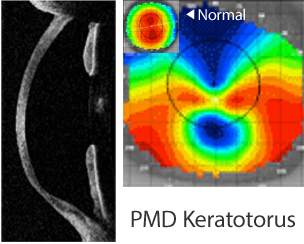 PMD Keratotorus, is a degenerative corneal condition, often confused with keratoconus. It usually affects only one eye, and is typically characterized by a clear, bilateral thinning in the inferior and peripheral