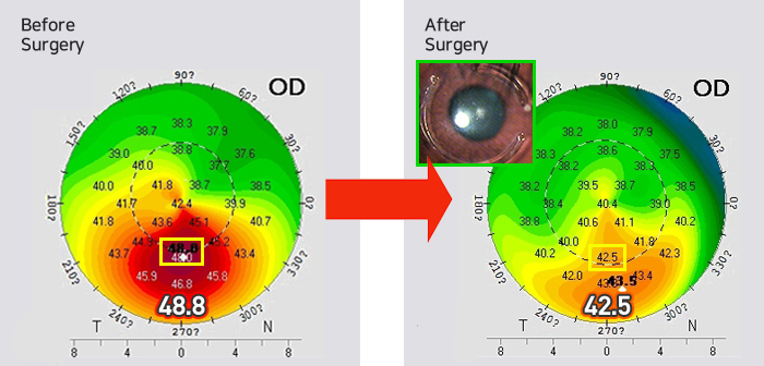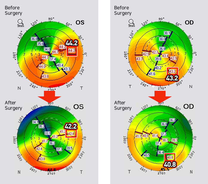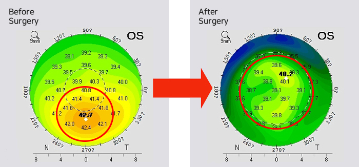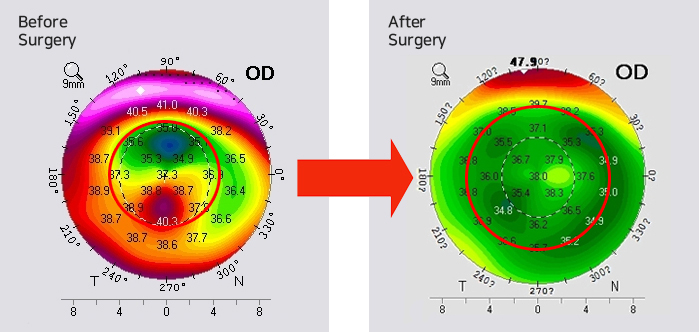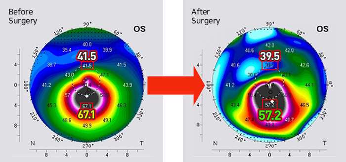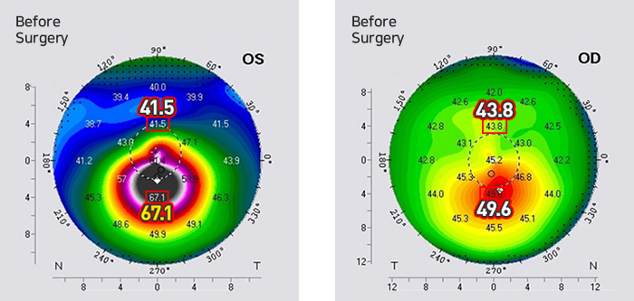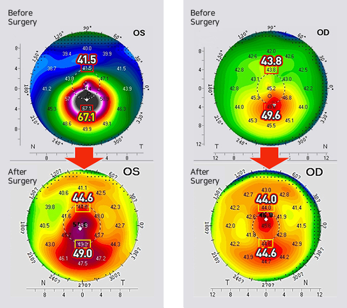 Park experienced sudden vision loss within a year and even had undergone several examinations at a university hospital before coming to EYEREUM. After more extensive examinations, Park was diagnosed with progressing PMD keratotorus, which is different from keratoconus.