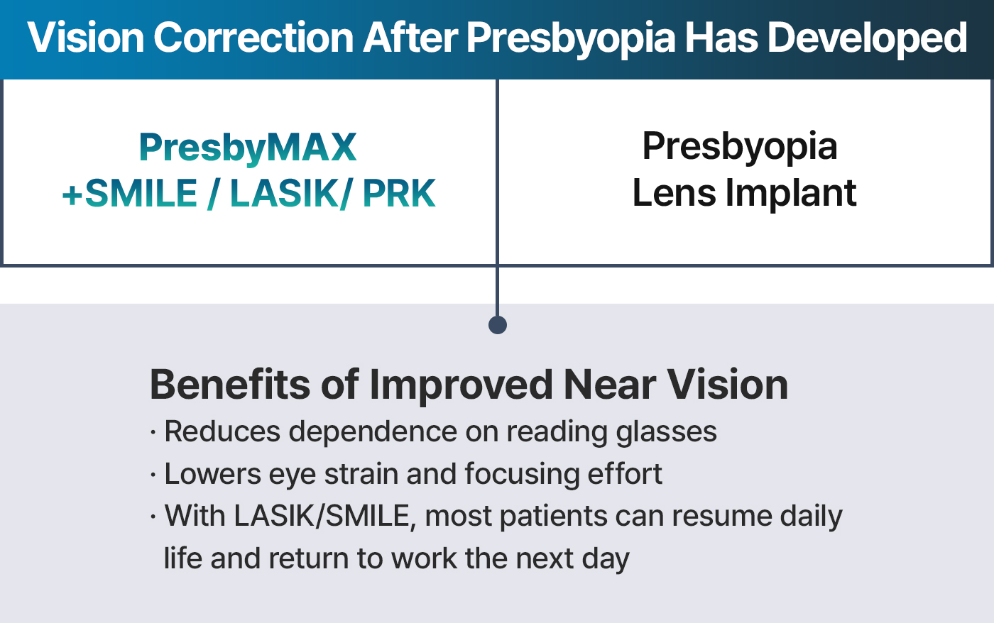 PresbyMAX® presbyopia correction is performed through a personalized 1:1 surgical design that considers the patient’s occupation and lifestyle, creating comfortable binocular vision at the distances they use most frequently.