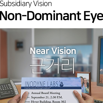 The intraocular lens implantation also applies the Monovision method and corrects both near and distant vision. The non-dominate eye is corrected by inserting a lens for near vision and the dominant eye undergoes standard LASIK surgery to improve distant vision. The main feature is that a near vision correcting lens is inserted to the non-dominant eye.