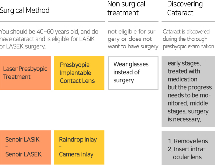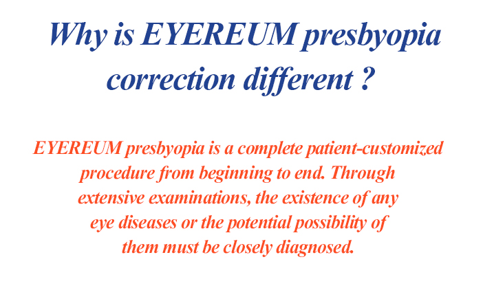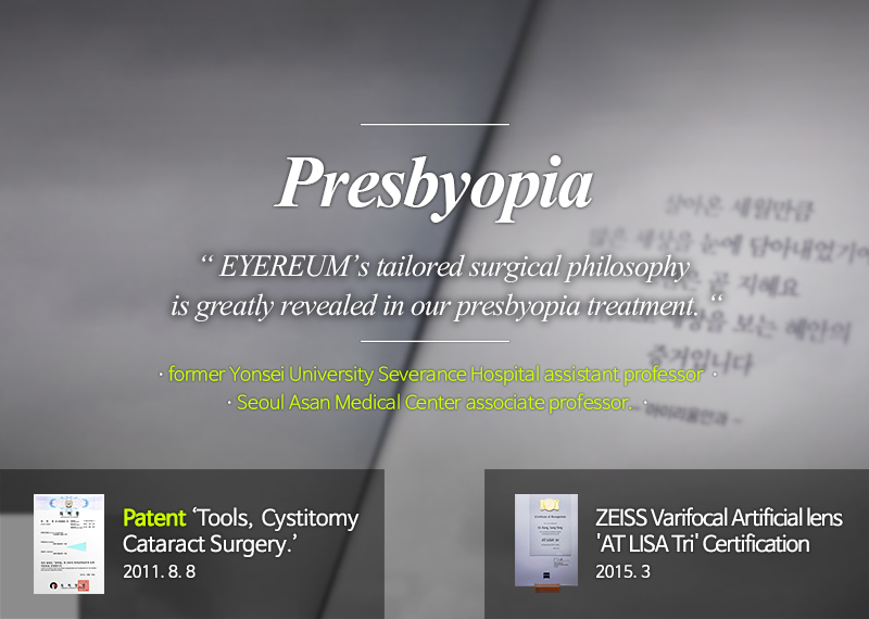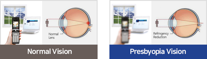 It is an aging process when the natural lenses and the surrounding parts of your eyes have grown too rigid to accommodate focus from far to near and back again. You may have trouble seeing objects close by and suffer from eye strain and headaches. If so, you should receive treatment to improve these symptoms. Recently, as the use of smart phones and tablets is increasing, presbyopia symptoms are also growing in people in their 40s and 50s. Also, the onset age seems to be becoming younger. So it is necessary to be more active towards the treatment, prevention, and management of presbyopia.