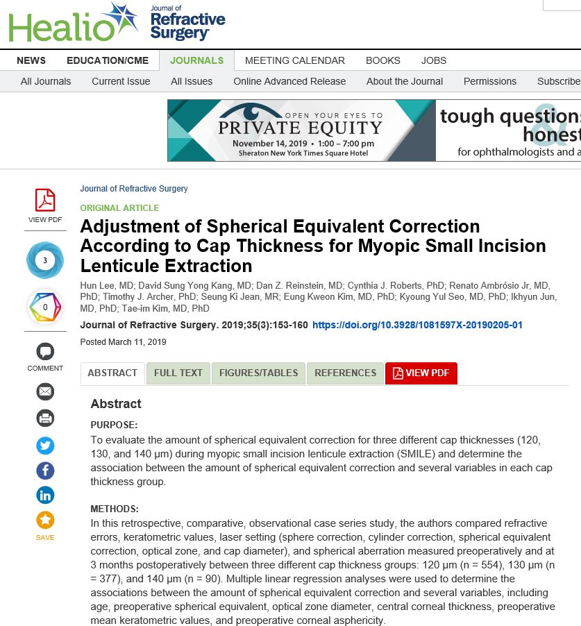 EYEREUM EYE CLINIC's new paper for safe SMILE treatment is published on JRS(Journal of Refractive Surgery).