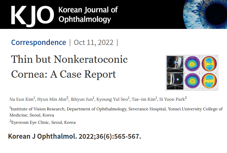 The paper, "Thin but Nonkeratoconic Cornea: A Case Report" by the Institute for Vision Research at Yonsei University and EYEREUN EYE CLINIC(Dr. Si Yoon Park) was published in the Korean Journal of Ophthalmology (KJO).