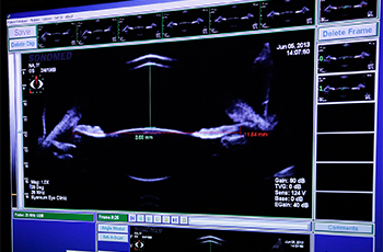 초음파를 이용하여 눈 속의 상태를 검사하는 것입니다. 이를 통해 백내장 수술이나 안내렌즈삽입술에 필요한 안축정 길이, 전방 깊이, 눈 속에 이물질, 망막의 상태 확인 등의 검사를 하게 됩니다.