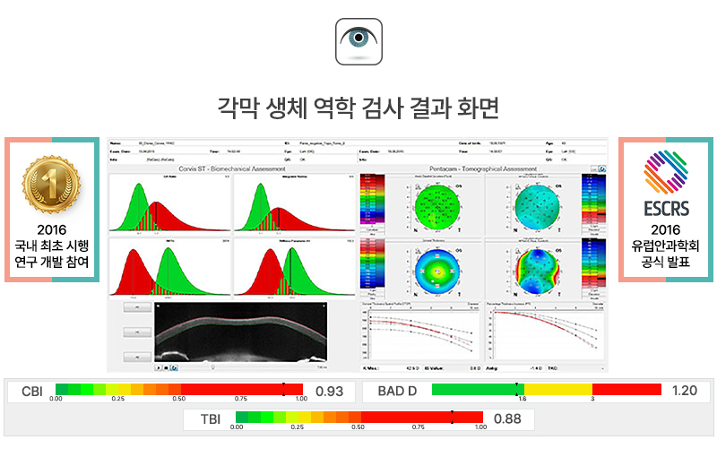 각막 생체 역학 검사는 기존 코르비스ST 각막 강성도 검사와 팬타캠 각막 검사 결과를 비교하여 수술 전 각막의 생체 역학적 상태를 가장 정밀하게 분석해줍니다.