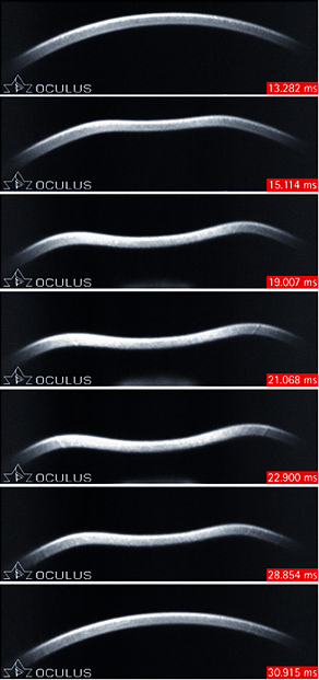 각막표면이 압력에 의해 변형되었다가 제자리로 돌아오기 까지의 영상.