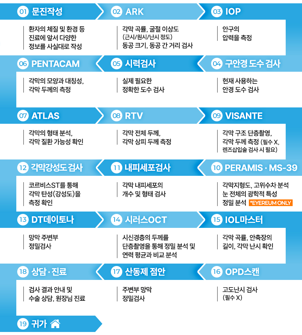 2025. 5월 기준 아이리움에서만 시행하는 PERAMIS, MS-39 검사 장비로 각막지형과 눈 전체의 광학적 특성을 정밀 측정하여 수술 장비에 직접 연동, 초정밀 각막 및 안구 전체의 웨이브프론트(Wavefront) 시력교정술을 실현합니다.