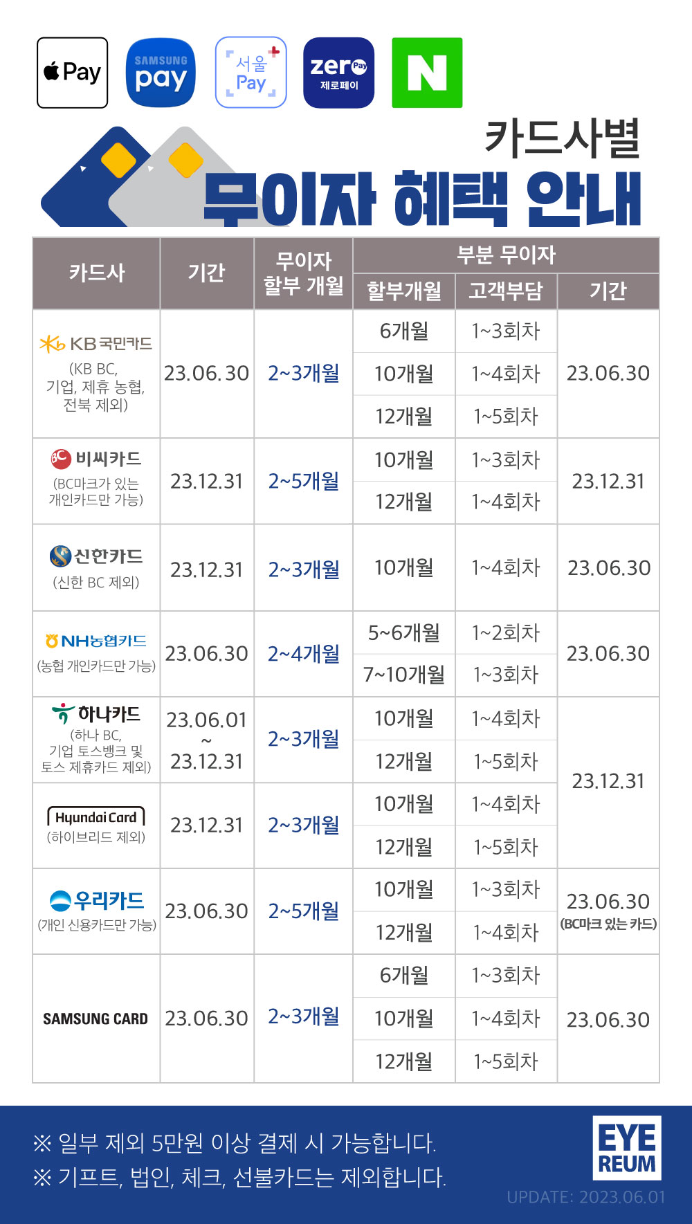 아이리움안과 카드사 별 무이자 할부 혜택